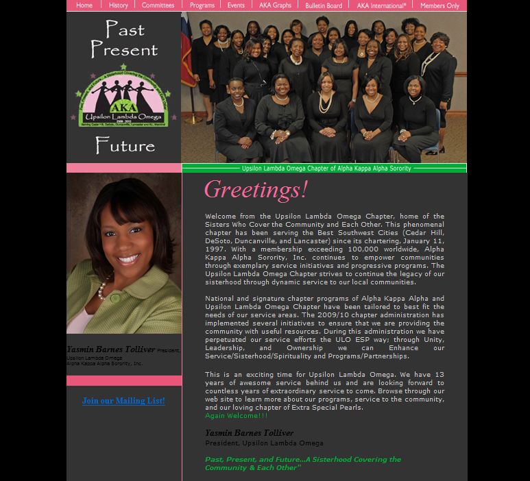 A sorority membership Website featuring members only portal, survey system, guestbook, event calendar, and photo album.